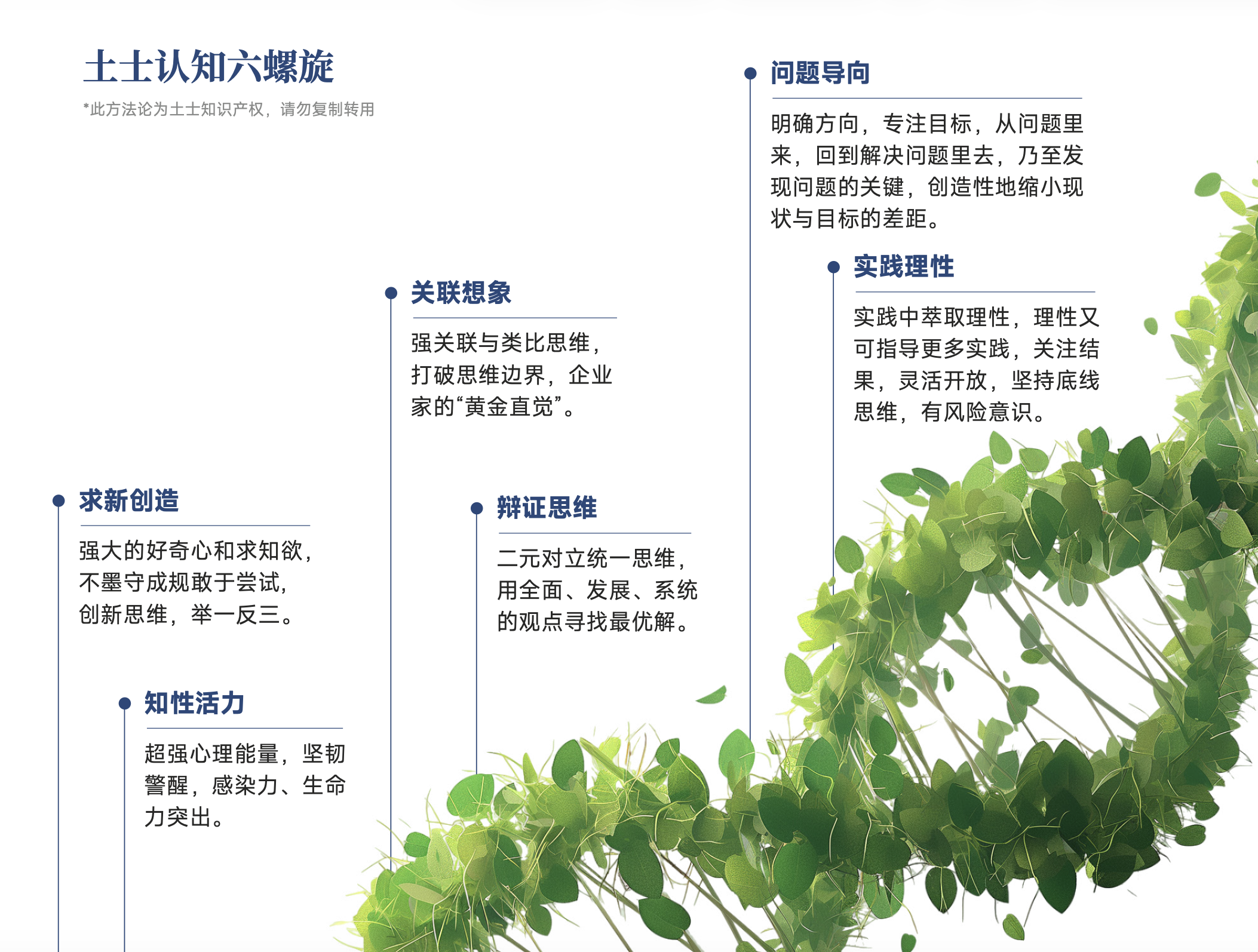 2017年,土士邀请时任清华大学心理学系主任、清华大学社会科学院院长、中国积极心理学发起人彭凯平教授进行了为期18个月的访谈和调研。从心理学和认知科学角度,访问了柳传志、王玉锁、马蔚华、王文京、邓锋等 30余位中国卓越的创业者和企业家,总结出了优秀商业人士的认知特质和培养方法。该研究成果作为土士的知识产权,构建了土士学习的系列方法论,并在经年使用和优化的过程中呈现出显著的学习效果。“土士认知六螺旋”被广泛应用于土士学习的全过程,最大程度地保证了土士同学学习的成效和体验。